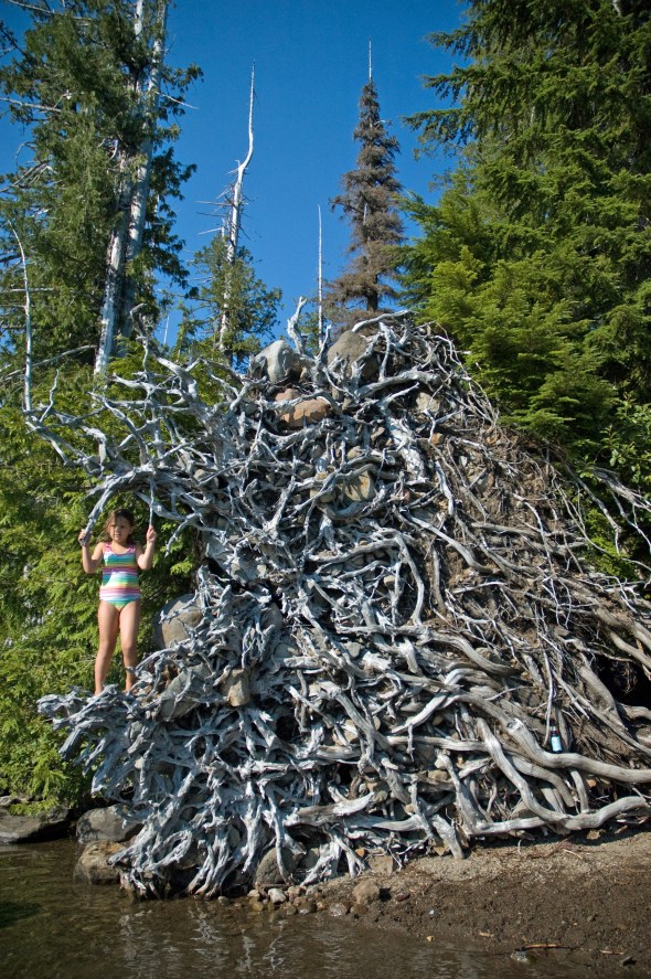 A simple stroll encircles Lost Lake as well, and despite the crowds on hot summer days, it still seems that you’re always able to find a spot here or there to set up for the afternoon and soak it all in. We did as much a couple weeks ago on one of the warmer Oregon weekends, and relished not only the lake, but trail-side huckleberries and salmon berries, squirt guns, elusive crawfish and newts, and a laid-out tree that invited all kinds of exploration.