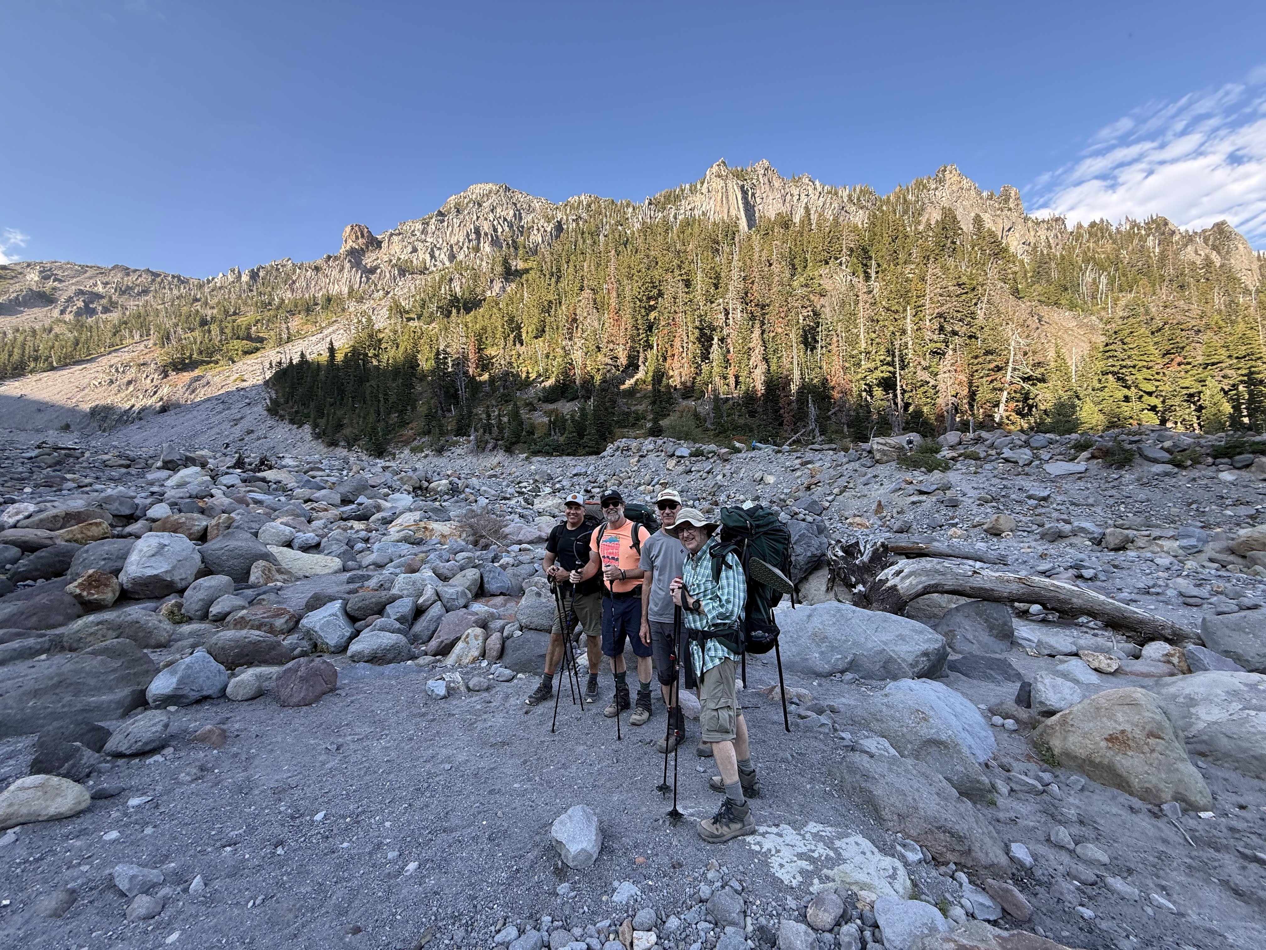But it didn’t. All six of us – a cadre of friends who’ve shared years of outdoor adventures together – made it down, albeit slowly, across the creek and back up a steep, long slog to the Cloud Cap Saddle Campground on the northeast side of Hood where we’d left a car four days and 41 miles earlier.