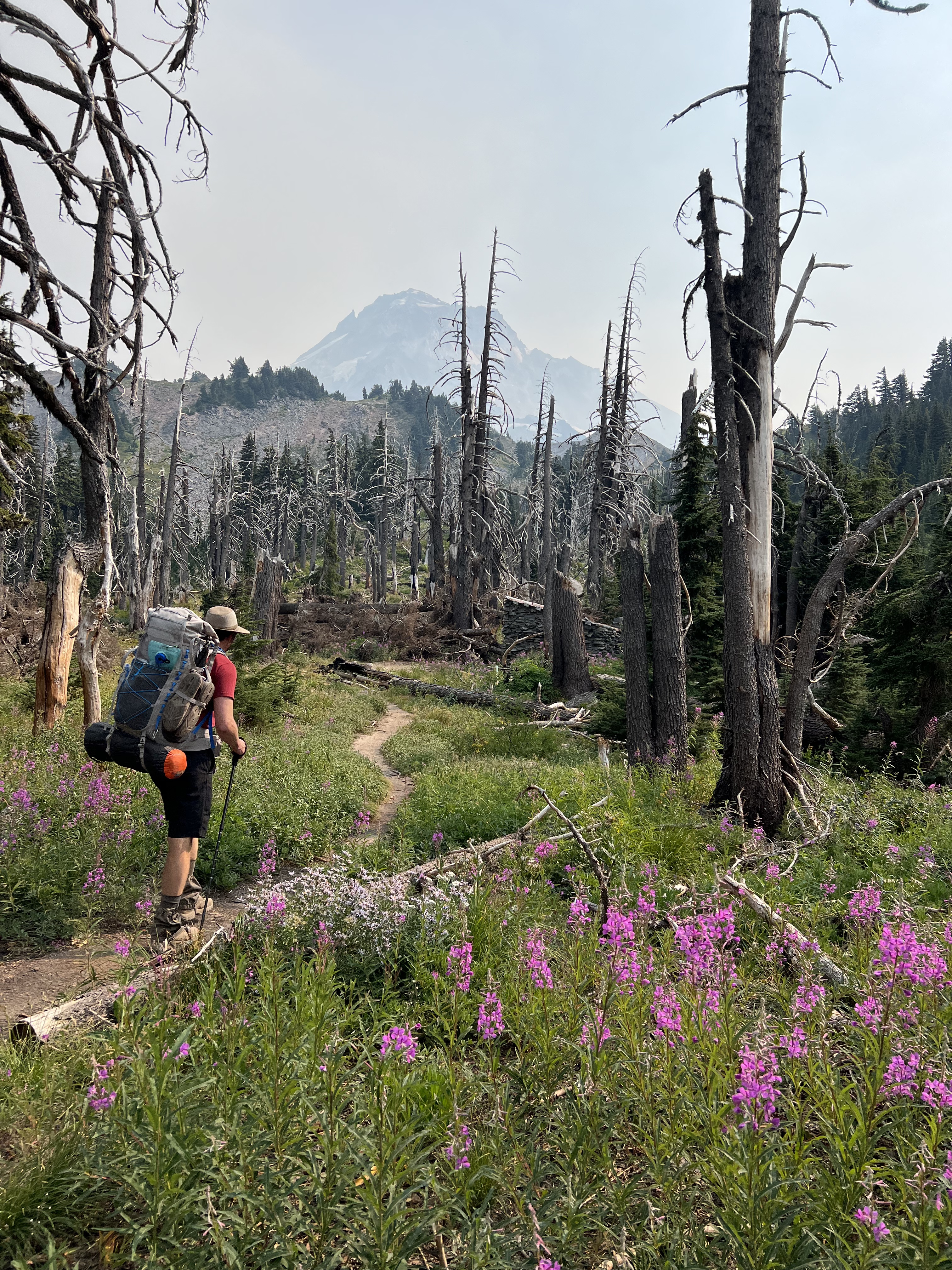We set out just after 9:30 a.m. It was windy, sure, and there was a bit of tension in the air. But the trail, which runs 42 miles around Mt. Hood and includes some 10,000 feet of elevation gain, starts out easy. The wind was at our backs. And not 45 minutes into it, after we’d first cross paths with a friendly foursome who we’d leapfrog with over the next four days, it was still and peaceful. Red flag warning? Never heard of it.