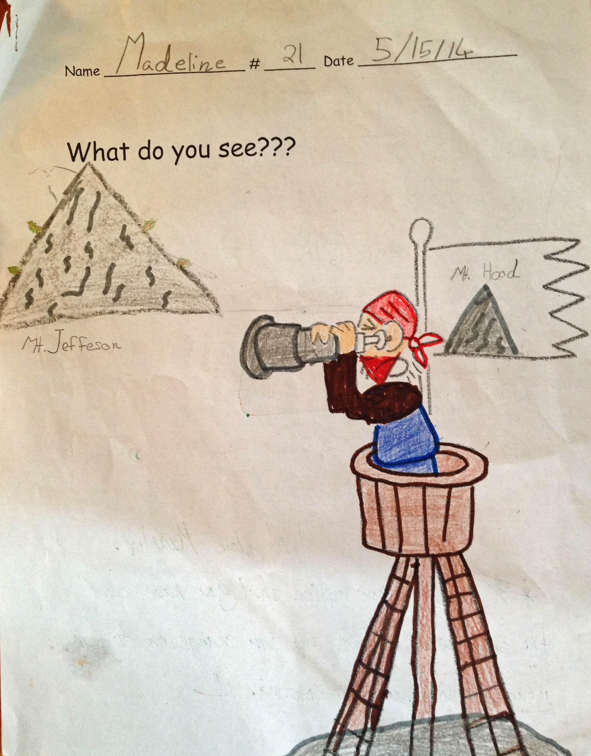Madeline reinforced that idea to me when she showed me what she had drawn at school this week. Granted, she’s got both Mount Hood and Mount Jefferson here, but the gist is the same.